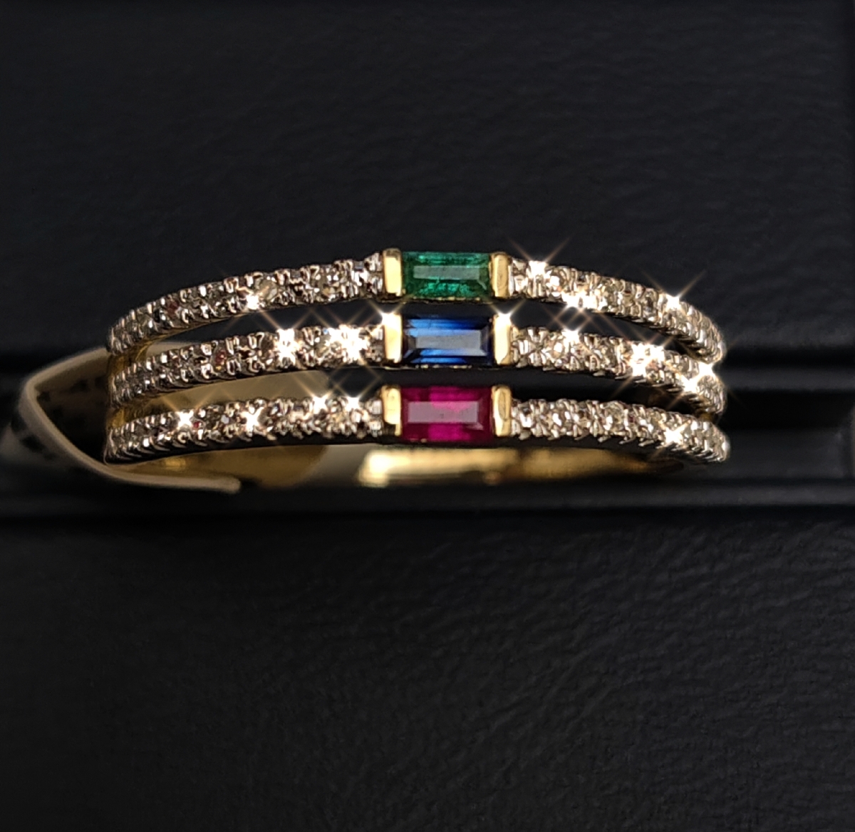 Gold Ring 585 / Smaragd, Saphire, Rubin / Brill. 0,1 ct. / Gr. 58