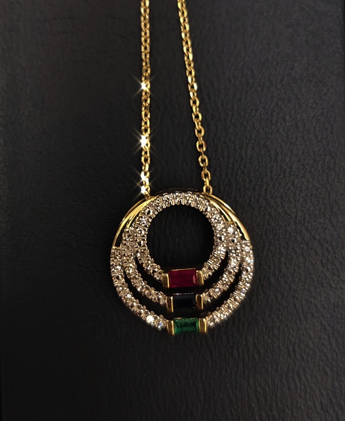 Collier Gold 585 / Smaragd, Saphire, Rubin / Brill. 0,1 ct. / Länge 45 cm.